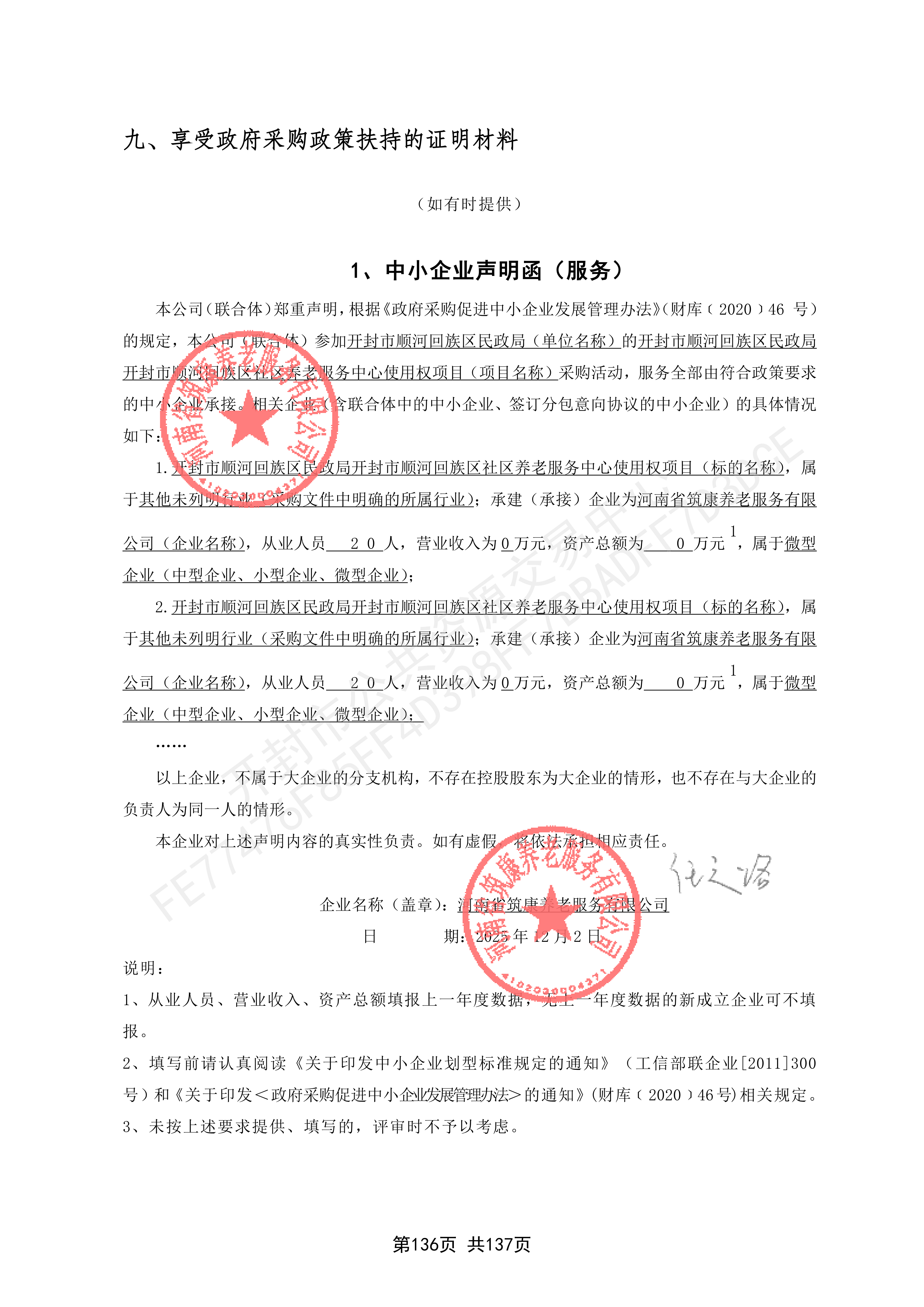 | ******街道六四六社区院内 ,该项目建设用地面积683.96 ㎡,房屋总建筑面积2785.71m2; ******服务中心的经营权、管理权、维修、维护等全部内容。 (3)服务质量:满足国家相关法律规定、现行行业标准和规范,符合招标人服务质量要求及管理要求; (4)运营期限:20年 (5)回报机制:用户付费(付款方式详见招标文件“投标人须知前附表 11.9”) (6)主要合作条件与要求:结合本项目的实际,本项目为养老服务******服务中心服务设施的经营、管理、维修、维护等全部内容;双方按照现行规定签订社会化运营合同(协议),明确运营权利与责任。如有违约,按照协议追究运营公司的违约责任。 (7)标包划分:本项目分1个包段 | |||||||||||||||||||||||||||||||