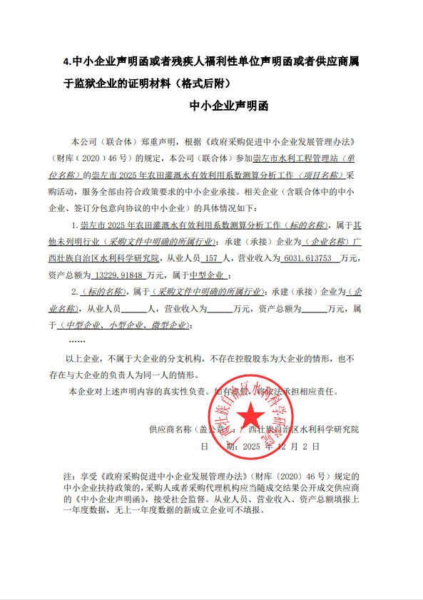 | 1 | 崇左市2025年农田灌溉水有效利用系数测算分析工作 | 崇左市2025年农田灌溉水有效利用系数测算分析工作 | 崇左市全市7个县(市、区)24个样点灌区2025年农田灌溉水有效利用系数测算分析 | 详见本公告的附件信息 | 合同签订之日起 30 日内提交成果报告送审稿,经专家评审后5日内提交最终的成果文件 | 符合现行国家相关标准、行业标准、地方标准或者其他标准、规范 |